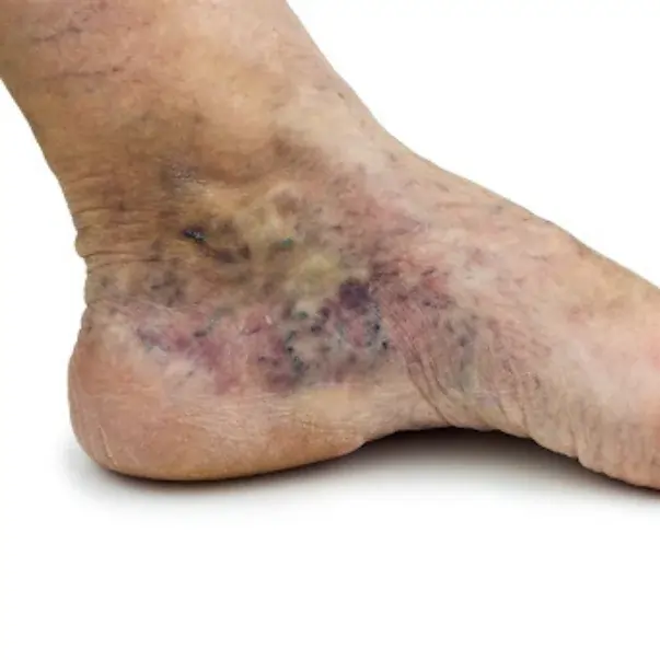 The skin around affected veins may darken, harden, or become dry. In advanced cases, painful ulcers can develop near the ankles due to prolonged poor circulation.